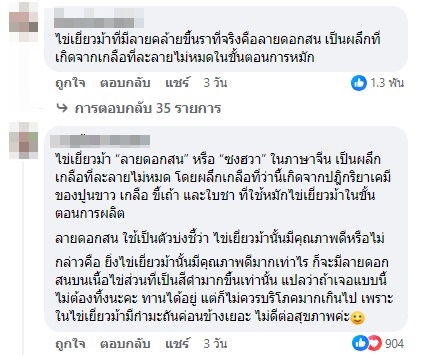 จากนั้นชาวเน็ตก็เข้ามาร่วมคอมเมนต์ ชี้ว่าแม้ลักษณะจะคล้ายรา แต่ไม่ใช่ ลวดลายที่เห็นนั้นเกิดจากผลึกเกลือที่เกิดขึ้นระหว่างการหมัก จนตกผลึกเป็นลวดลายดังกล่าว ซึ่งเรียกกันว่าลายดอกสน นับเป็นของดี หายาก ยืนยันว่ากินได้