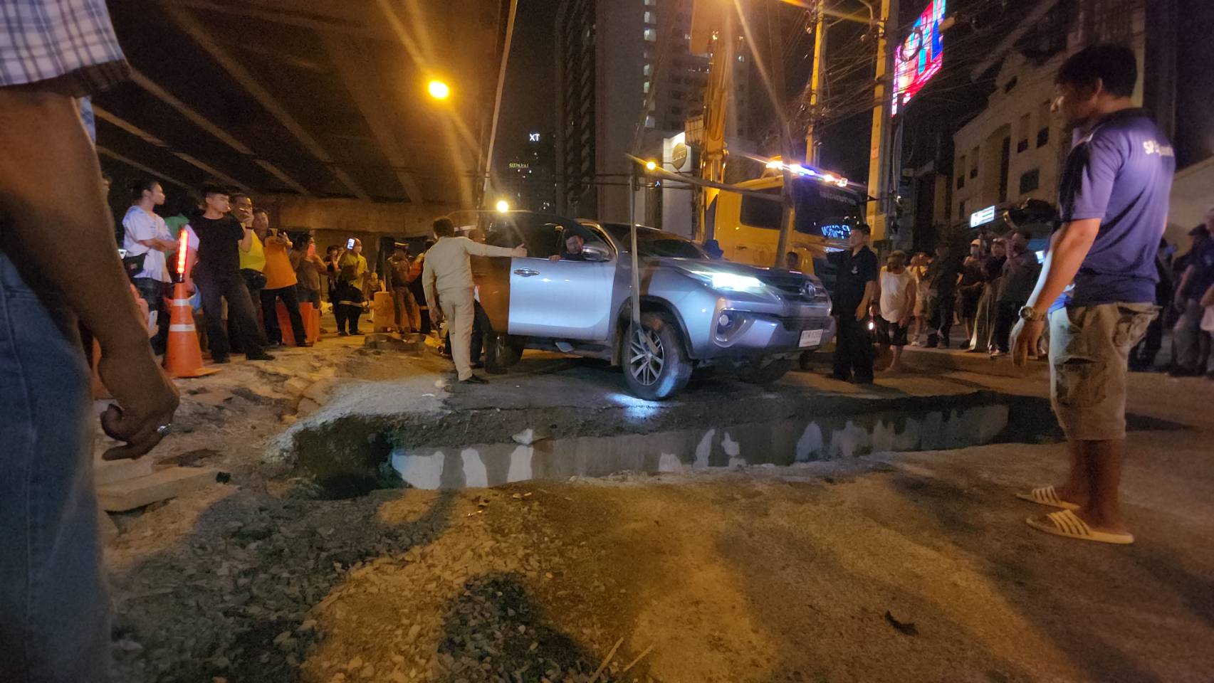 หวาดเสียว สิบล้อเหยียบฝาท่อที่กำลังสร้างเป็นบ่อพักน้ำพัง ฟอร์จูนเนอร์ดวงซวยขับตามหลัง หวิดตกหลุมทั้งคัน เหตุเกิดบนถนนจตุรทิศ