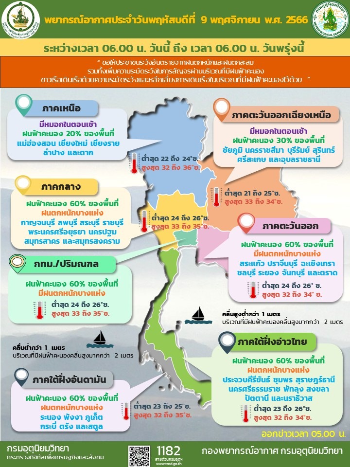 วันนี้ (9 พ.ย.) กรมอุตุนิยมวิทยา พยากรณ์อากาศ 24 ชั่วโมงข้างหน้า บริเวณความกดอากาศสูงหรือมวลอากาศเย็นกำลังอ่อนปกคลุมประเทศไทยตอนบนและทะเลจีนใต้ ทำให้บริเวณดังกล่าวมีหมอกในตอนเช้า ในขณะที่คลื่นกระแสลมฝ่ายตะวันออกเคลื่อนเข้าปกคลุมบริเวณภาคกลางตอนล่าง ภาคตะวันออก อ่าวไทย และภาคใต้