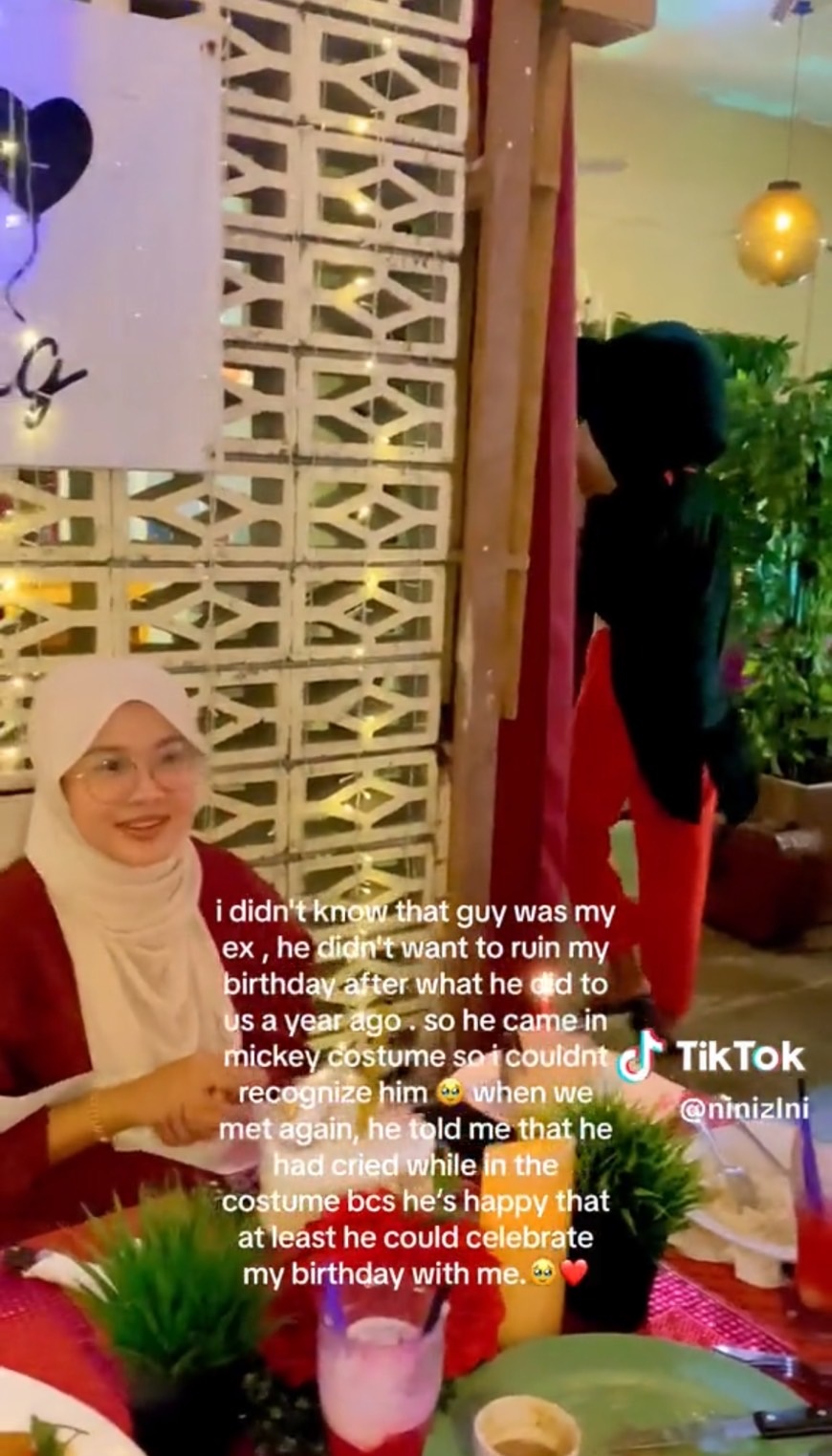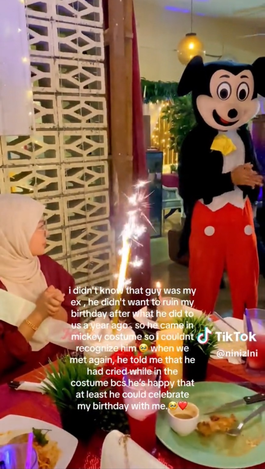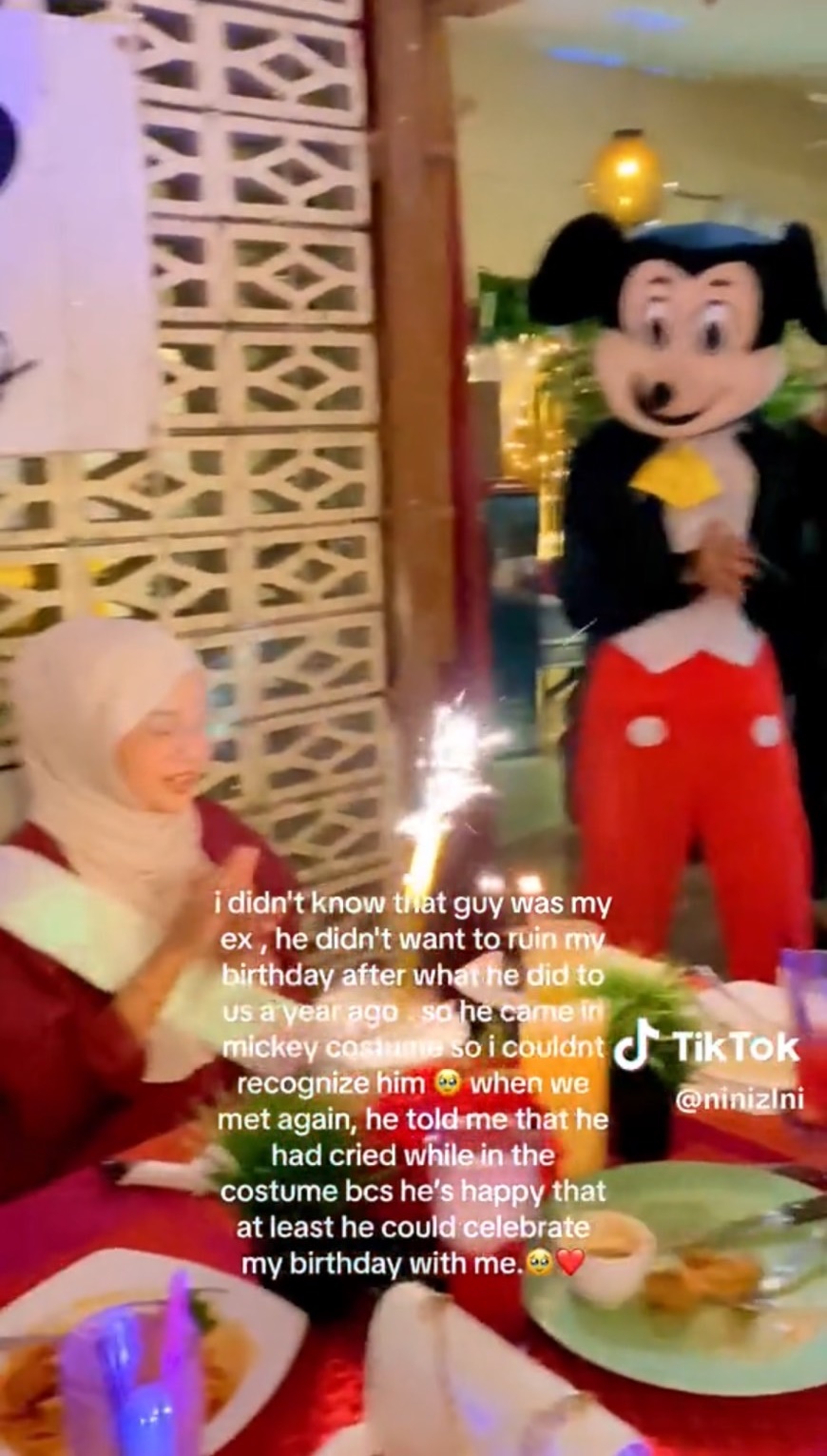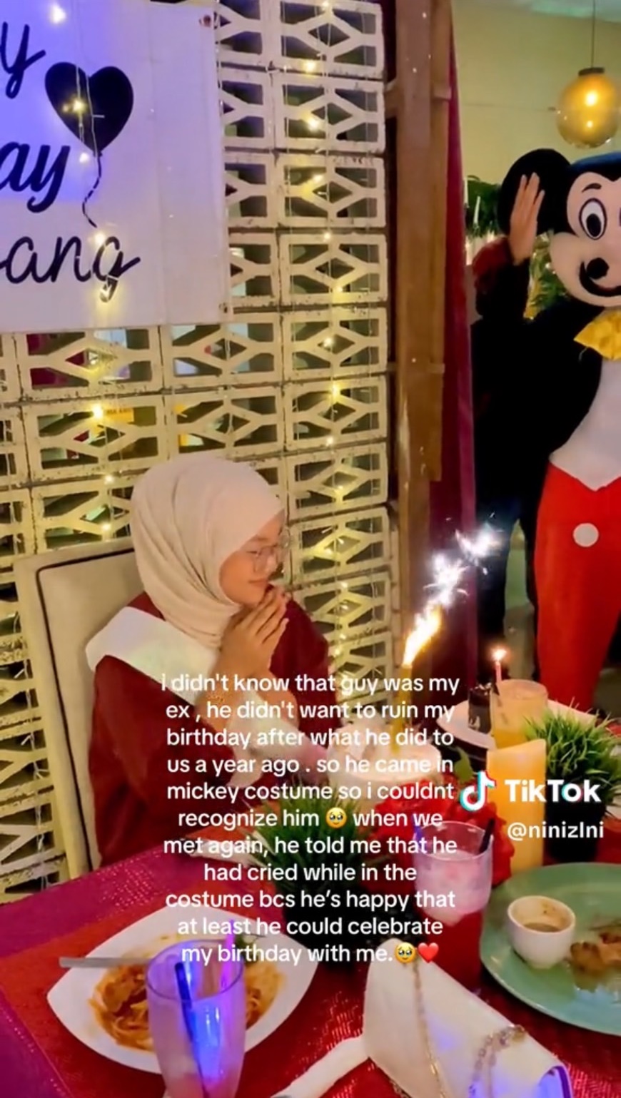 "ตอนที่เราเจอกันอีกครั้ง เขาบอกฉันว่าเขาร้องไห้ขณะอยู่ในชุดนั้น เพราะเขามีความสุขที่อย่างน้อยก็สามารถได้ฉลองวันเกิดของฉัน ร่วมกันกับฉันได้" นินิ ระบุในคลิป