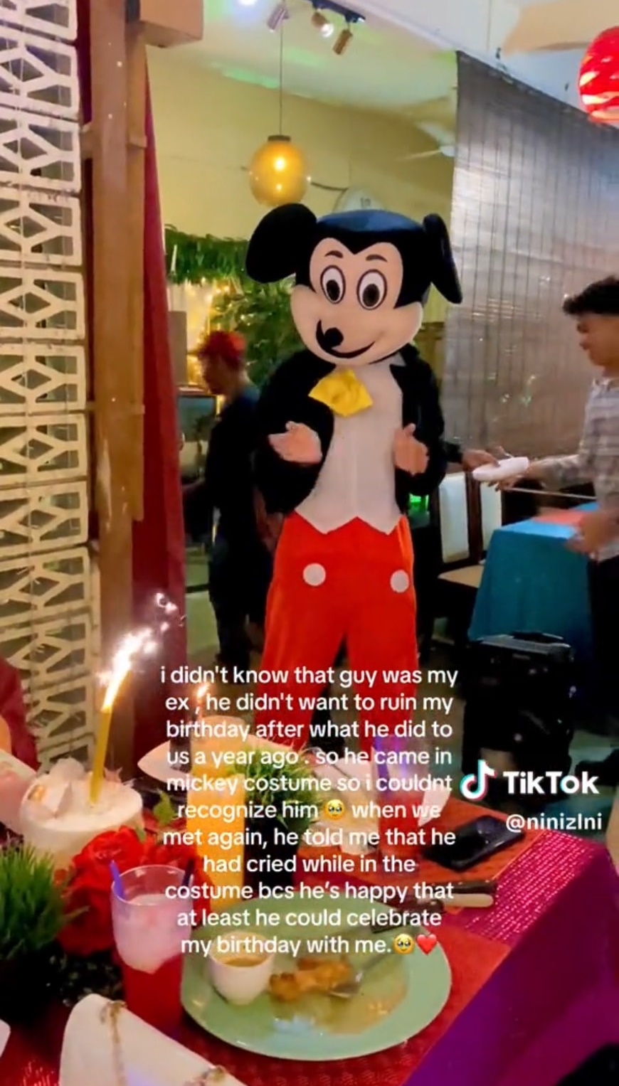 จากคลิปเผยให้เห็นว่าขณะที่ นินิ กำลังได้รับคำอวยพรจากเพื่อน ๆ และเป่าเค้กวันเกิดอยู่นั้น มีคนที่สวมชุดมิกกี้เมาส์เดินเข้ามาร่วมสร้างสีสัน และอยู่เคียงข้างสาวเจ้าของวันเกิดด้วย ไม่เพียงแค่เขาจะร่วมร้องเพลงวันเกิด แต่ยังอยู่รอจนเธอเป่าเทียนเสร็จ ก่อนจะเข้ามาทักทายและเดินจากไป