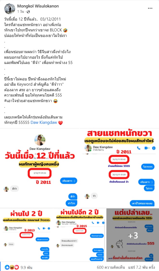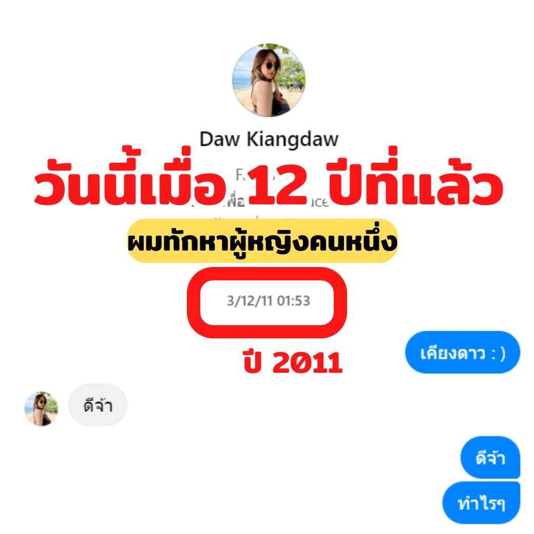 ผู้โพสต์ ระบุว่า "วันนี้เมื่อ 12 ปีที่แล้ว.. 03/12/2011 ใครที่สายแชตหนักขวา อย่าเพิ่งท้อ ทักเขาไปทุกปีจนกว่าเขาจะ BLOCK ปล่อยให้หน้าที่ท้อเป็นของเขาไม่ใช่เรา
