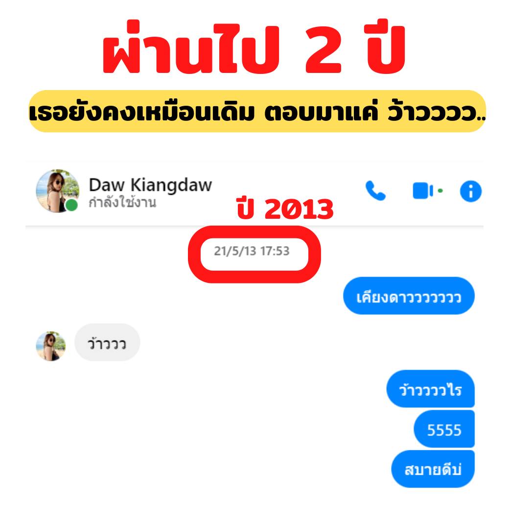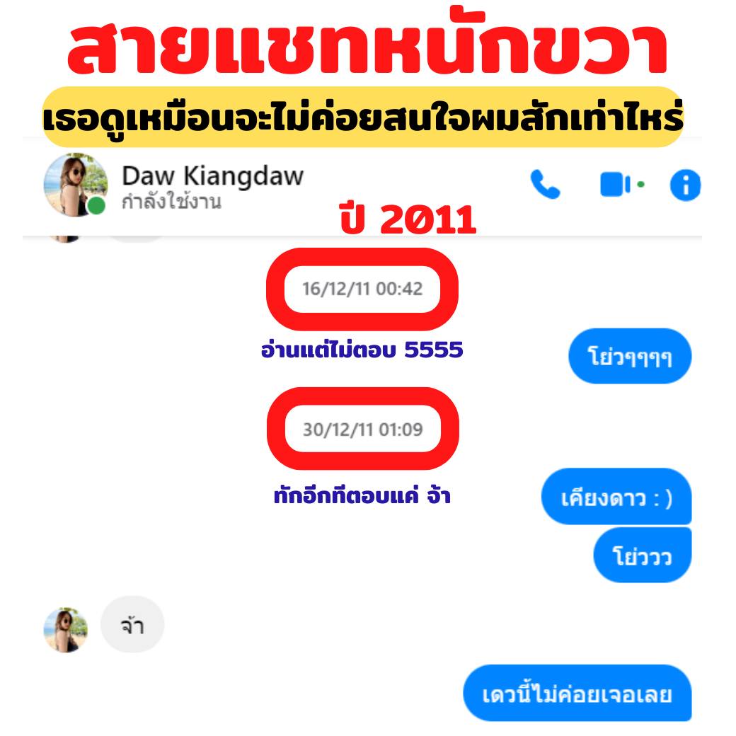 ในโพสต์จะเห็นว่า ผู้โพสต์ทักไปหาหญิงสาวชื่อ เคียงดาว ว่า "ดีจ้า" ในปี 2011 ซึ่งแชตก็หนักขวามาก เพราะบางครั้งฝ่ายหญิงอ่านแต่ไม่ตอบ หรือตอบสั้น ๆ แค่ "จ้า"