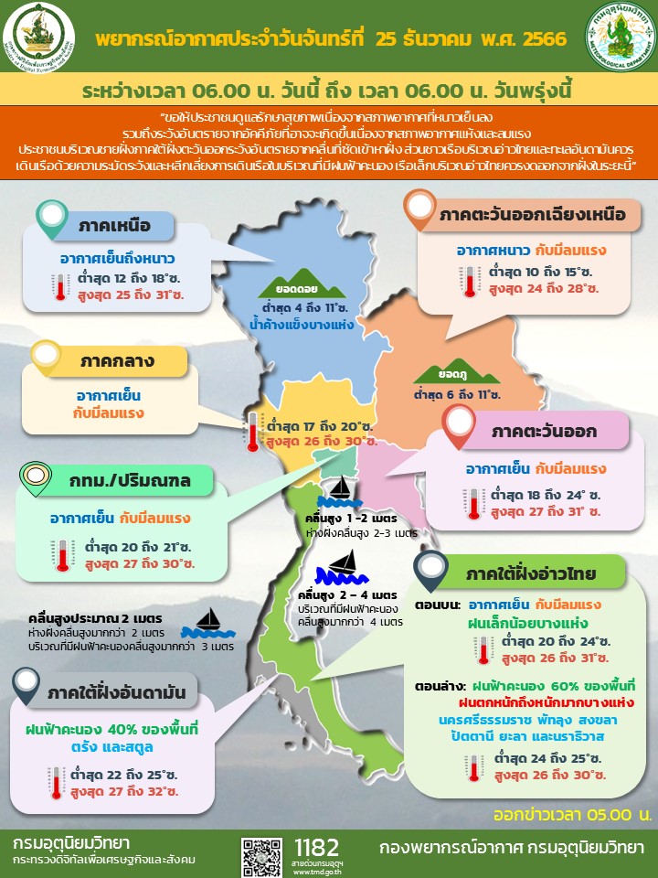 วันนี้ (25 ธ.ค.) กรมอุตุนิยมวิทยา พยากรณ์อากาศ 24 ชั่วโมงข้างหน้า บริเวณความกดอากาศสูงหรือมวลอากาศเย็นกำลังแรงที่ปกคลุมประเทศไทยและทะเลจีนใต้เริ่มอ่อนกำลังลง แต่ยังคงมีกำลังค่อนข้างแรง ลักษณะเช่นนี้ทำให้ประเทศไทยมีอากาศเย็นถึงหนาวต่อเนื่อง กับมีลมแรง สำหรับบริเวณยอดดอยของภาคเหนือมีอากาศหนาวถึงหนาวจัด อุณหภูมิต่ำสุด 4-11 องศาเซลเซียส