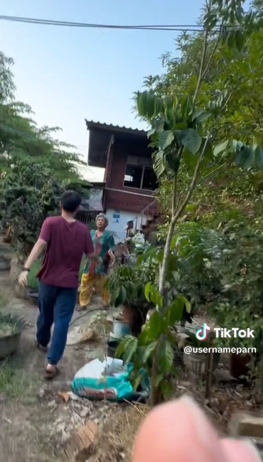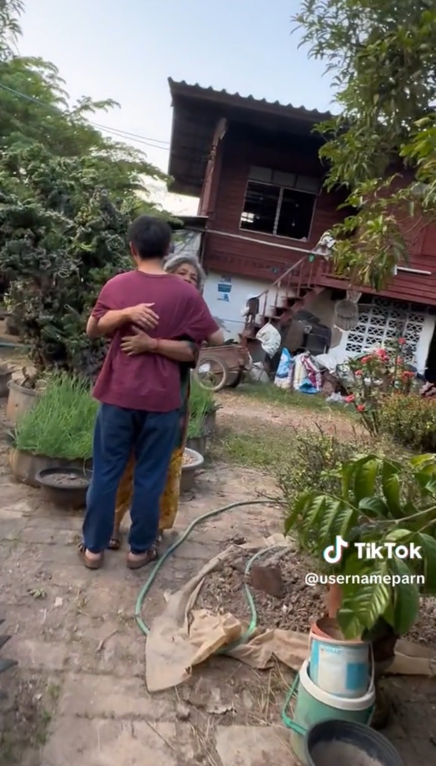 ซึ่งในตอนแรกหลานชายเดินขึ้นไปหาบนบ้านแต่ไม่เจอ จึงเดินลงไปดูที่ข้างบ้าน ซึ่งทันทีที่คุณยายเห็นหน้าหลานชาย ก็รีบเดินเข้ามากอดทันที