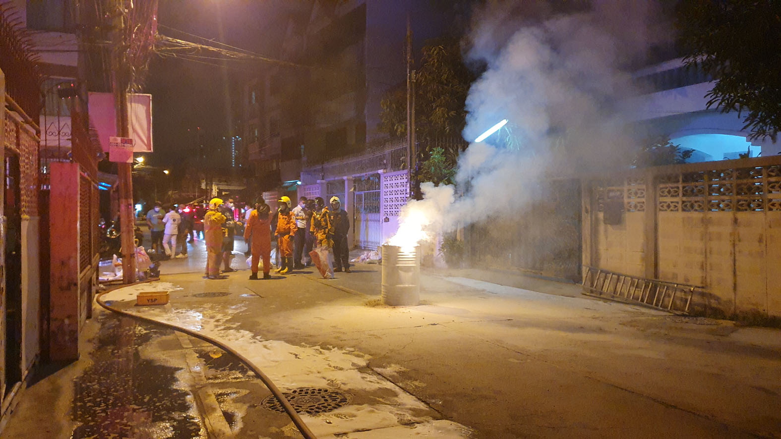 ที่เกิดเหตุอยู่ภายในซอยพรสว่าง ซึ่งเป็นซอยเชื่อมระหว่าง ซอยวัดด่านสำโรง และ ซอยแบริ่ง โดยเจ้าหน้าที่พบกลุ่มควันพวยพุ่งออกมาจากท้ายรถยนต์กระบะที่ติดแครี่บอย ซึ่งภายในมีถังขนาด 200 ลิตร มีควันพวยพุ่งออกมาจากถัง เจ้าหน้าที่ต้องฉีดน้ำสเปรย์ลดควันบริเวณตัวรถ เจ้าหน้าที่จึงปิดกั้นที่เกิดเหตุไม่ให้ผู้ที่ไม่มีส่วนเกี่ยวข้องผ่าน ก่อนที่จะนำถังลงมาด้านล่าง ซึ่งจากการใช้น้ำนั้นไม่สามารถทำให้เพลิงที่ลุกไหม้อยู่ในถังสงบได้ แต่กลับทำให้เพลิงลุกแรงขึ้นจนทำให้เกิดเสียงดังเป็นระยะ เจ้าหน้าที่จึงยุติการใช้น้ำ ก่อนที่จะวางแผนใช้ทรายแห้งมาทำการกลบเพื่อให้เพลิงสงบ เนื่องจากถังดังกล่าวนั้น บรรจุสารเคมีอลูมิเนียมฟอสไฟด์ ที่ใช้กำจัดศัตรูพืชทางการเกษตร