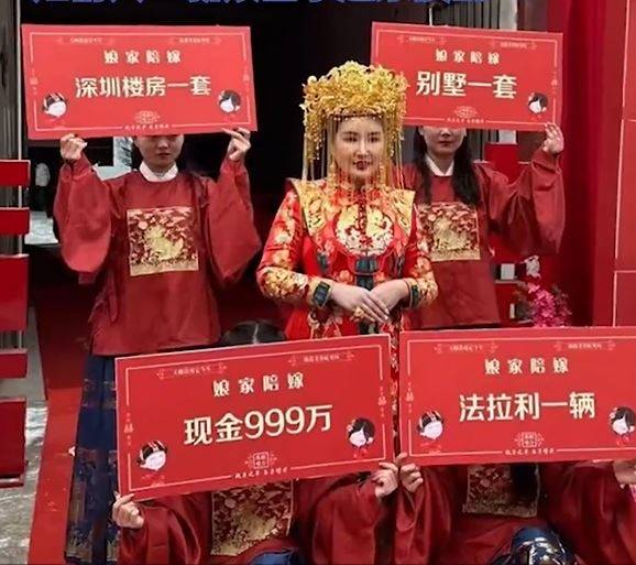 เพื่อนเจ้าสาว 4 คนแต่งกายด้วยชุดสีแดงสด ถือป้ายรายการสินสอด รวมถึงบ้านในเซินเจิ้น รีสอร์ตวิลล่า รถเฟอร์รารี เงินสด9.99 ล้านหยวน (มากกว่า 50 ล้านบาท) และทองคำมากมาย สินสอดทั้งหมดมีมูลค่ามากกว่า 30 ล้านหยวน (มากกว่า 153 ล้านบาท)