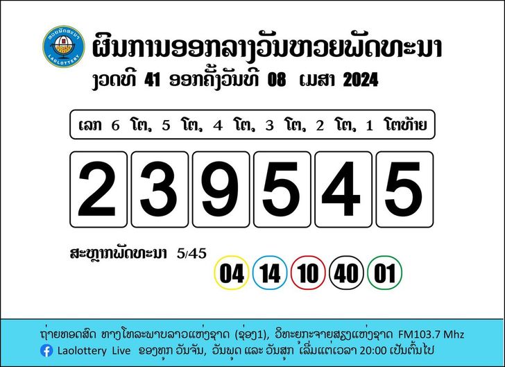 ลุ้นสด หวยลาววันนี้ 08/04/67 ถ่ายทอดสดหวยลาว หวยลาวล่าสุด หวยลาวพัฒนา 8 เม.ย. 67 หวยลาวย้อนหลัง หวยลาว 6 ตัว วันนี้ออกอะไร งวด 8 เมษายน 2567 Laolottery หวยลาว ออกรางวัลทุก วันจันทร์ วันพุธ และ วันศุกร์