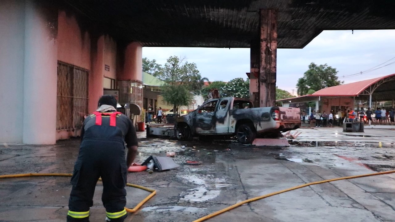 หลังจากสกัดเพลิงลงได้ เจ้าหน้าที่เข้าตรวจสอบที่เกิดเหตุ พบรถยนต์ปิคอัพยี่ห้อมิตชูมิชิ รุ่นไททัน ทะเบียน 8935 สุรินทร์ สภาพชนเข้ากับตู้จ่ายน้ำมันภายในปั๊ม และถูกไหม้เสียหายทั้งคัน และรอบๆ พบตู้จ่ายน้ำมันในปั๊มพังเสียหาย มีรถจักรยานยนต์ถูกไฟไหม้เสียหายทั้งคัน 1 คัน โดยหลังเกิดเหตุเจ้าหน้าที่ยังคงฉีดน้ำหล่อเลี้ยงบริเวณปั๊มต่อเนื่อง และกั้นพื้นที่รอการตรวจสอบจากกองพิสูจน์หลักฐาน