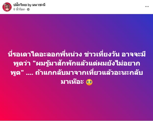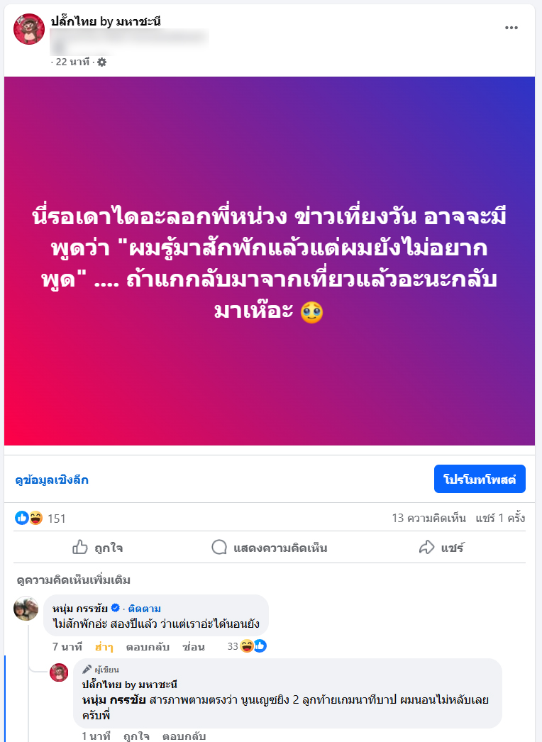 และจากประเด็นดังกล่าวที่สังคมให้ความสนใจอยู่นั้น พิธีกรคนดังอย่าง หนุ่ม กรรชัย ได้เข้ามาคอมเมนต์ในเพจ ปลั๊กไทย by มหาชะนี โดยในเพจได้เขียนข้อความไว้ว่า "นี่รอเดาไดอะลอกพี่หน่วง ข่าวเที่ยงวัน อาจจะมีพูดว่า "ผมรู้มาสักพักแล้วแต่ผมยังไม่อยากพูด" .... ถ้าแกกลับมาจากเที่ยวแล้วอะนะกลับมาเห๊อะ"