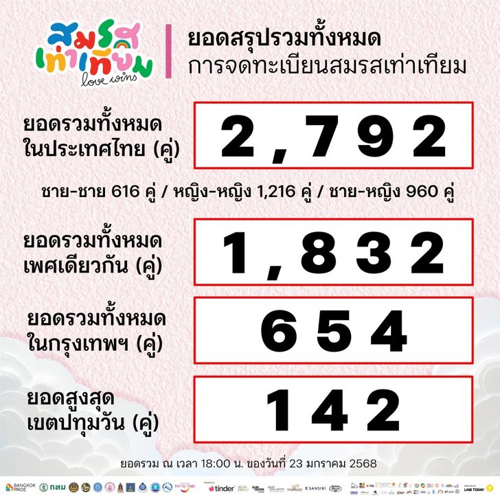สมรสเท่าเทียมวันแรก เปิดสถิติจดทะเบียนทั่วประเทศ 2,799 คู่ คู่รักหญิง-หญิง มากกว่า ชาย-ชาย เท่าตัว