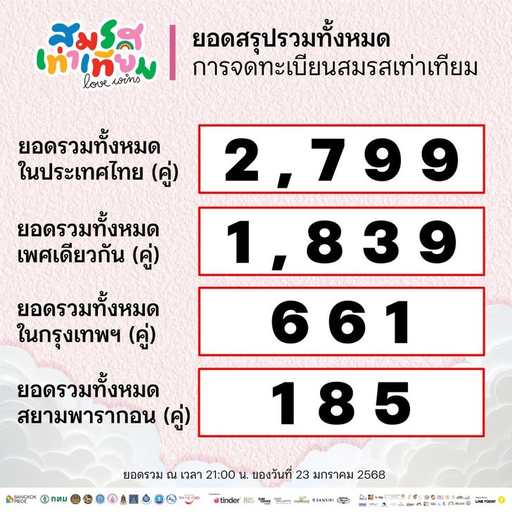 ล่าสุดเพจเฟซบุ๊ก บางกอก ไพรด์ รายงาน ยอดรวมสรุปคู่สมรสเท่าเทียมที่จดทะเบียนสมรสทั่วประเทศ 2,799 คู่ เป็นเพศเดียวกัน 1,839 คู่