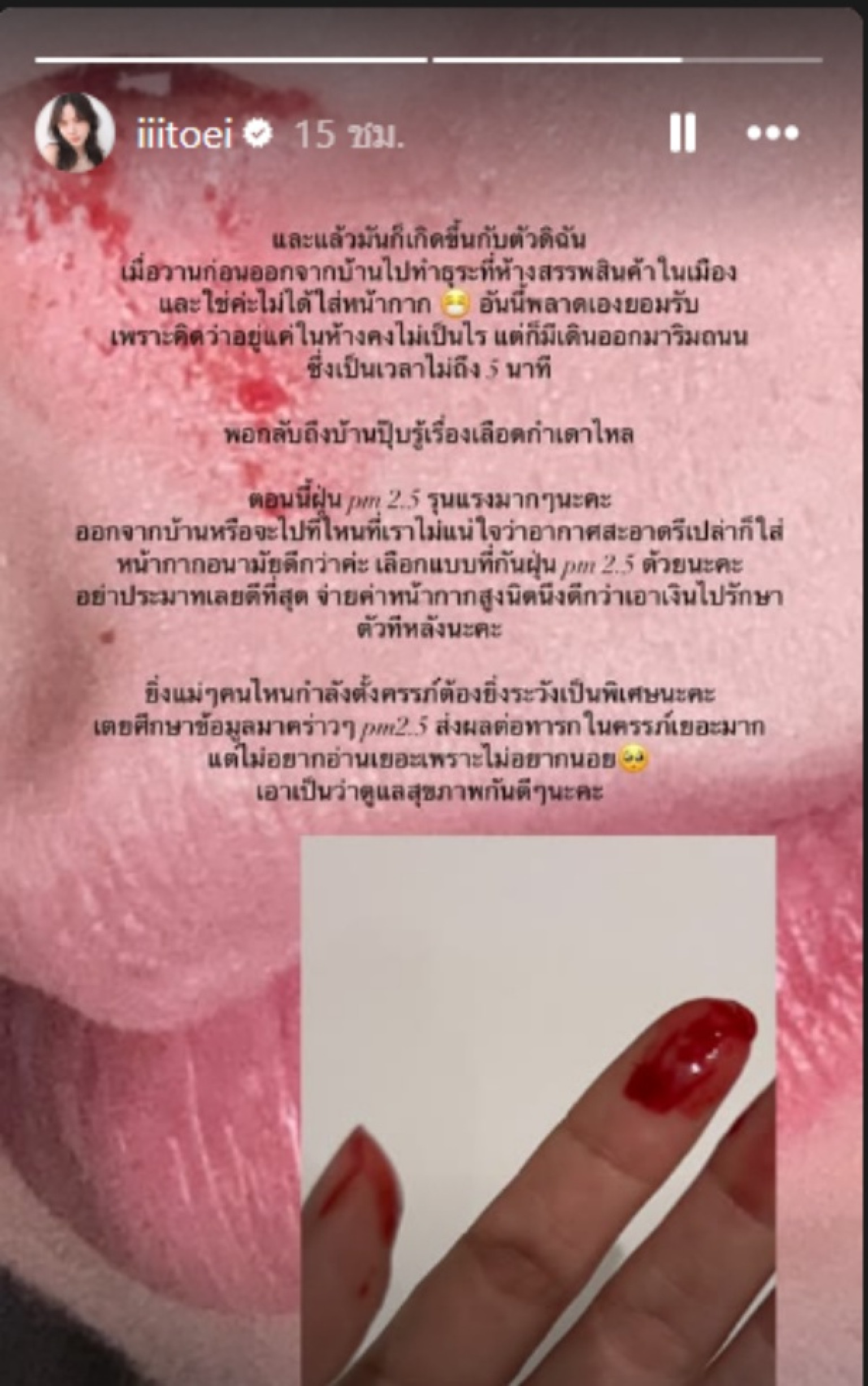 สถานการณ์ฝุ่น PM 2.5 ยังคงน่าเป็นห่วง ล่าสุดว่าที่คุณแม่คนสวย ใบเตย สุวพิชญ์ ภรรยาของนักร้องดัง ปั๊บ โปเตโต้ ได้แชร์ประสบการณ์ตรงผ่านอินสตาแกรมสตอรี่ @iiitoei เพื่อเตือนใจทุกคนให้ระมัดระวังฝุ่นละอองขนาดเล็กที่กำลังเป็นปัญหาใหญ่ในหลายพื้นที่