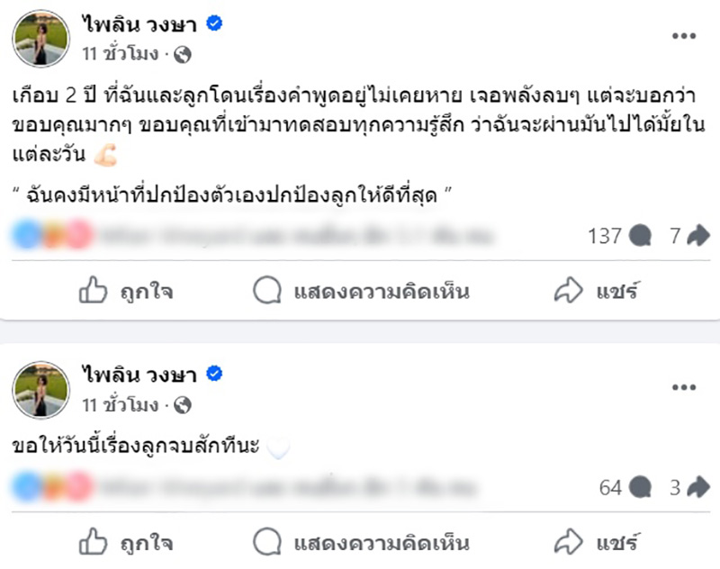 นอกจากนี้ เธอยังได้เผยความในใจเพิ่มเติมว่า "เกือบ 2 ปี ที่ฉันและลูกโดนเรื่องคำพูดอยู่ไม่เคยหาย เจอพลังลบๆ แต่จะบอกว่าขอบคุณมากๆ ขอบคุณที่เข้ามาทดสอบทุกความรู้สึก ว่าฉันจะผ่านมันไปได้มั้ยในแต่ละวัน ฉันคงมีหน้าที่ปกป้องตัวเองปกป้องลูกให้ดีที่สุด"