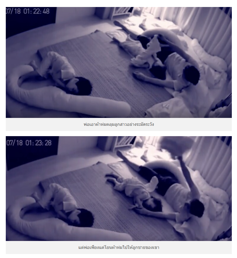 ในภาพจากกล้องวงจรปิด คุณพ่อคนหนึ่งนอนหลับอยู่กลางลูกสองคน คือลูกชายคนโต และลูกสาวคนเล็ก แต่แล้วจู่ๆ ในเวลาช่วงตี 1 ลูกสาวก็เริ่มขยับตัวเพราะรู้สึกหนาว พ่อจึงตื่นขึ้นมาแล้วรีบดึงผ้าห่มห่มให้ลูกสาวอย่างอ่อนโยน แต่สิ่งที่ทำให้ชาวเน็ตวิพากษ์คือ เด็กชายที่นอนอยู่ไม่ไกล ก็กำลังหนาวจนขดตัว แต่พ่อกลับแค่คว้าเอาผ้าห่มแล้วโยนใส่ลูกชายแบบไม่แม้แต่จะลุกมาดูแลเช่นเดียวกับลูกสาว