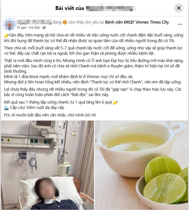 กรณีล่าสุดที่ได้รับความสนใจอย่างมากบนโลกออนไลน์ คือเรื่องราวของผู้หญิงชาวเวียดนามที่ออกมาเล่าประสบการณ์ ว่าเธอเริ่มต้นดื่มน้ำมะนาวเพื่อ "ล้างสารพิษ" หลังจากได้รับคำแนะนำจากเพื่อนและโพสต์ต่างๆ บนโซเชียล โดยในช่วงแรกเธอดื่มวันละ 1 ลูก แต่ภายในเวลา 1 เดือน เพิ่มขึ้นเป็น 6 ลูกทุกเช้า สุดท้ายต้องเข้ารับการรักษาฉุกเฉินในโรงพยาบาล เนื่องจากภาวะลำไส้และกระเพาะอาหารอักเสบเฉียบพลัน