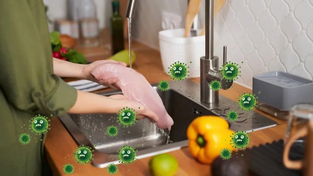 การล้างเนื้อดิบโดยตรงใต้น้ำ อาจทำให้เชื้อโรคที่อยู่บนผิวเนื้อกระจายไปทั่วครัว ไม่ว่าจะเป็นอ่าง จาน ช้อน หรือแม้กระทั่งเสื้อผ้าของคุณเอง โดยเฉพาะเนื้อไก่ที่อาจมีเชื้อ Campylobacter และ Salmonella ดังนั้นแนะนำให้แช่ในน้ำเย็นเพื่อให้เลือดหรือน้ำคาวออก แล้วล้างภาชนะที่ใช้ทันที พร้อมฆ่าเชื้อบรรดาอุปกรณ์ที่สัมผัสเนื้อดิบทั้งหมดด้วย