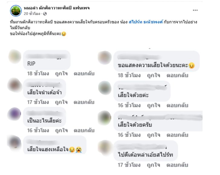 ทางด้าน “หมอลำ ตักศิลาวาทะศิลป์ แฟนเพจ” ก็ได้แสดงความเสียใจต่อเหตุการณ์นี้เช่นกันโดยโพสต์รูปภาพพร้อมระบุข้อความว่า “ทีมงานตักศิลาวาทะศิลป์ ขอแสดงความเสียใจกับครอบครัวของ น้อง สไปร์ท ธณัชพงศ์ กับการจากไปอย่างไม่มีวันกลับ ขอให้น้องไปสู่ภพภูมิที่ดีนะคะ”