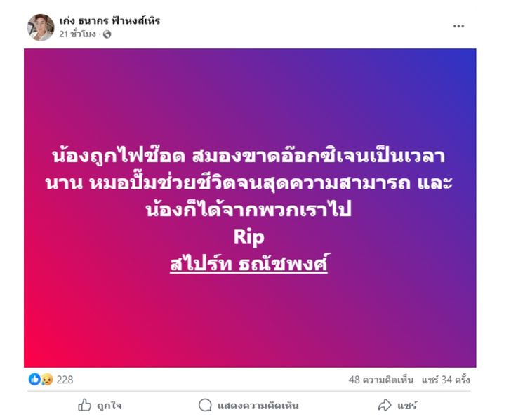 แต่ก็ต้องพบกับเรื่องน่าเศร้าเมื่อ “สไปร์ท ธณัชพงศ์” พิธีกรและหนึ่งในสมาชิกคณะหมอลำได้เสียชีวิตลงโดยผู้ใช้งาน Facebook “เก่ง ธนากร ฟ้าหงส์เหิร” ได้โพสต์ข้อความแจ้งให้ทราบว่า “น้องถูกไฟช๊อต สมองขาดอ๊อกซิเจนเป็นเวลานาน หมอปั๊มช่วยชีวิตจนสุดความสามารถ และน้องก็ได้จากพวกเราไป Rip สไปร์ท ธณัชพงศ์”