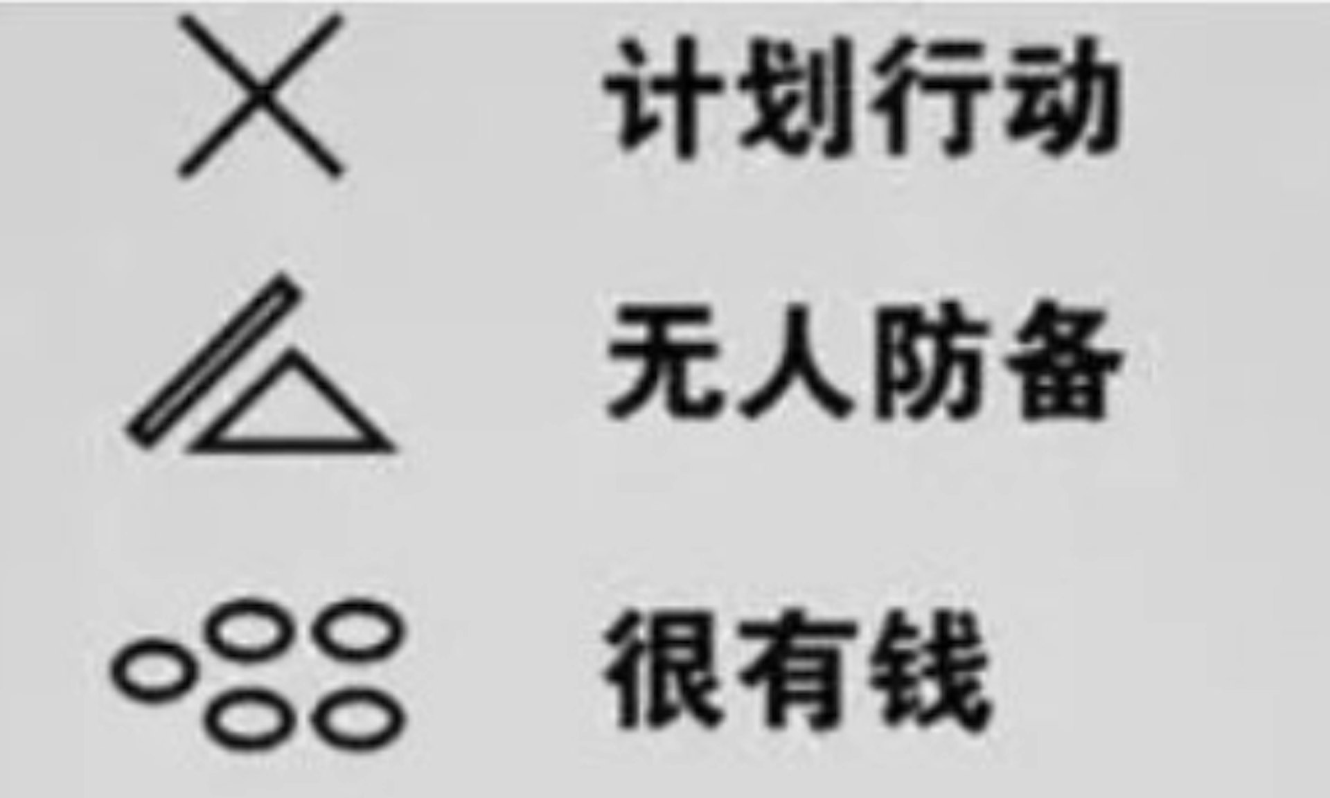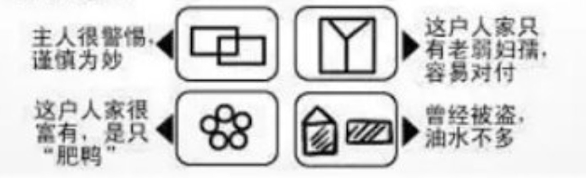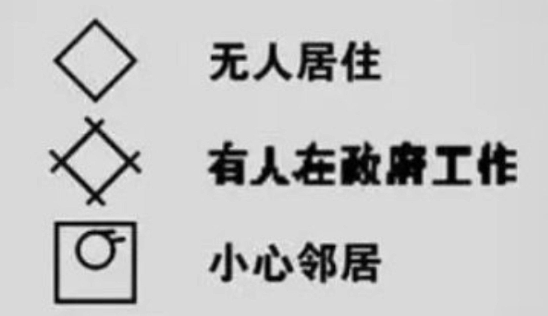 ชายชาวจีนคนหนึ่งกลับบ้านแล้วพบว่ามีสัญลักษณ์แปลกๆ ถูกเขียนไว้ที่ผนังหน้าประตูบ้าน เขาจึงสงสัยว่าอาจเป็นเครื่องหมายที่โจรขโมยใช้ “ติดตาม” บ้านเป้าหมาย อย่างไรก็ดี หลังจากค้นหาข้อมูลออนไลน์ จึงรู้ว่าสัญลักษณ์นั้นมีความหมายว่า “บ้านนี้ไม่มีเงินทองให้ขโมย” ทำให้เขารู้สึกพูดไม่ออกและหัวเราะกับสถานการณ์ที่เหมือนถูกโจร “ดูถูกเหยียดหยาม” ถึงหน้าประตูบ้านอย่างน่าขัน
