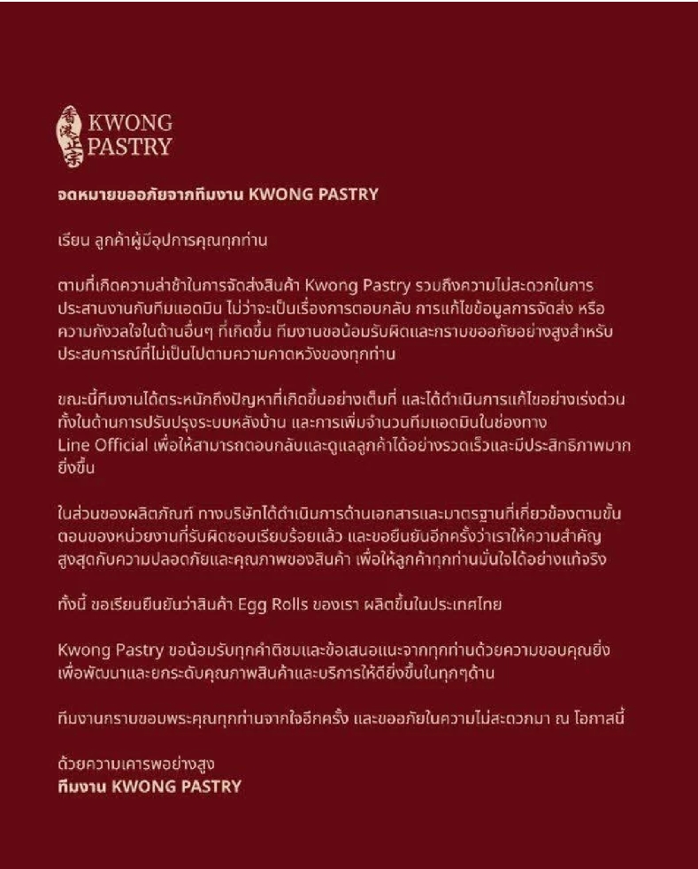 ทั้งนี้ ขอเรียนยืนยันว่าสินค้า Egg Rolls ของเรา ผลิตขึ้นในประเทศไทย Kwong Pastry ขอน้อมรับทุกคำติชมและข้อเสนอแนะจากทุกท่านด้วยความขอบคุณยิ่งเพื่อพัฒนาและยกระดับคุณภาพสินค้าและบริการให้ดียิ่งขึ้นในทุกๆด้าน ทีมงานกราบขอบพระคุณทุกท่านจากใจอีกครั้ง และขออภัยในความไม่สะดวกมา ณ โอกาสนี้ด้วยความเคารพอย่างสูง ทีมงาน KWONG PASTRY”