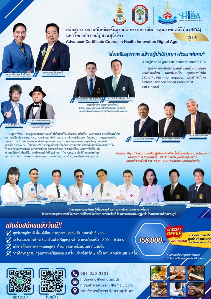 ติดต่อสอบถามเพิ่มเติมได้ที่ Line: hida official โทรศัพท์ : 083-015-3333 Email : hidassru@ssru.ac.th