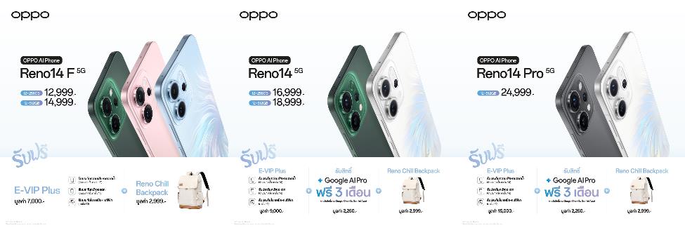 - OPPO Reno14 F 5G (8GB+256GB) ราคา 11,999 บาท (เฉพาะช่องทางอีคอมเมิร์ซและ OPPO Brand Shop), (12GB+256GB) ราคา 12,999 บาท และ (12GB+512GB) ราคา 14,999 บาท