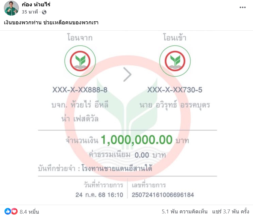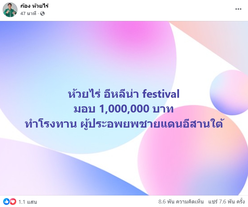 สุดยอด! "ก้อง ห้วยไร่" มอบเงิน 1 ล้านบาท ตั้งโรงทานช่วยเหลือชายแดนอีสานใต้ก้อง ห้วยไร่ มอบเงิน 1 ล้านบาท ตั้งโรงทานช่วยเหลือชายแดนอีสานใต้ หลังเหตุปะทะไทย-กัมพูชา