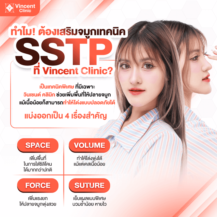 ที่ Vincent Clinic มีการพัฒนาเทคนิคการ เสริมจมูก ที่เป็นของตัวเองขึ้นมา นั่นคือ เทคนิค SSTP ซึ่งสามารถตอบโจทย์คนที่มีเนื้อจมูกน้อยแต่อยากได้ทรงจมูกที่โด่งพุ่ง ช่วยเพิ่มพื้นที่ในการซิลิโคนให้มากขึ้น ลดอาการบวมช้ำให้น้อยลง พักฟื้นน้อย กลับไปทำกิจวัตรประจำวันตามปกติได้เร็วขึ้น (ผลลัพธ์ขึ้นอยู่กับรายบุคคล)