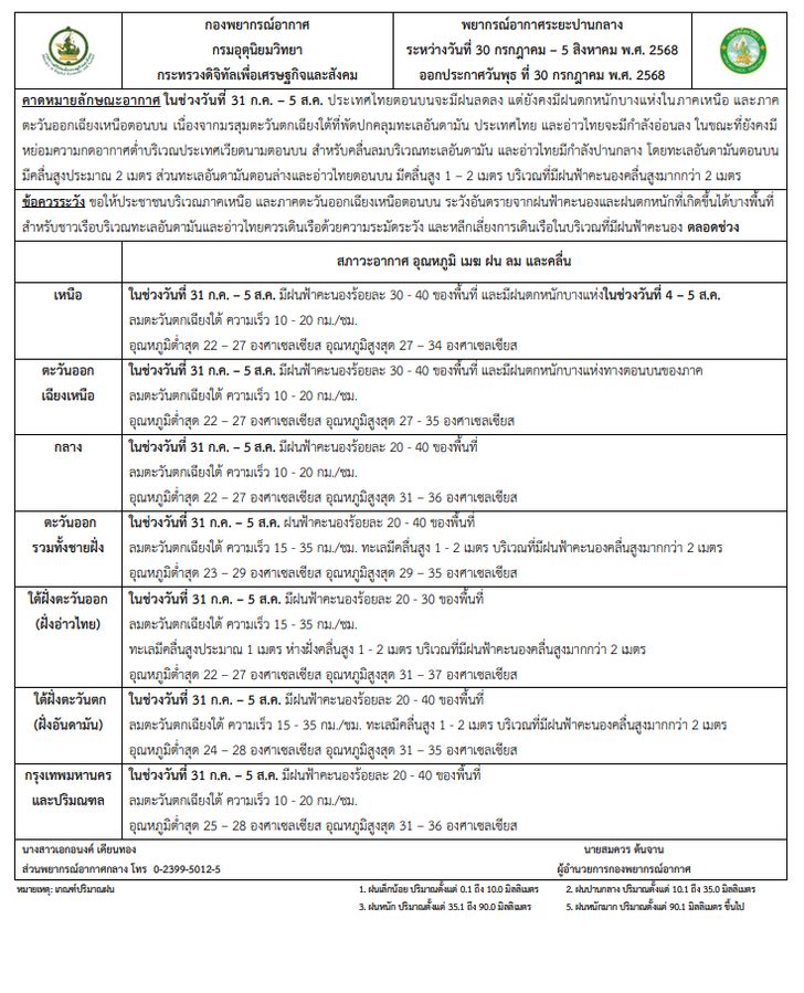 เมื่อวันที่ 30 กรกฎาคม 2568 เวลาประมาณ 12:00 น. กรมอุตุนิยมวิทยาออกประกาศ คาดหมายอากาศทั่วไป 30 กรกฎาคม – 5 สิงหาคม พ.ศ. 2568 โดยระบุดังนี้
