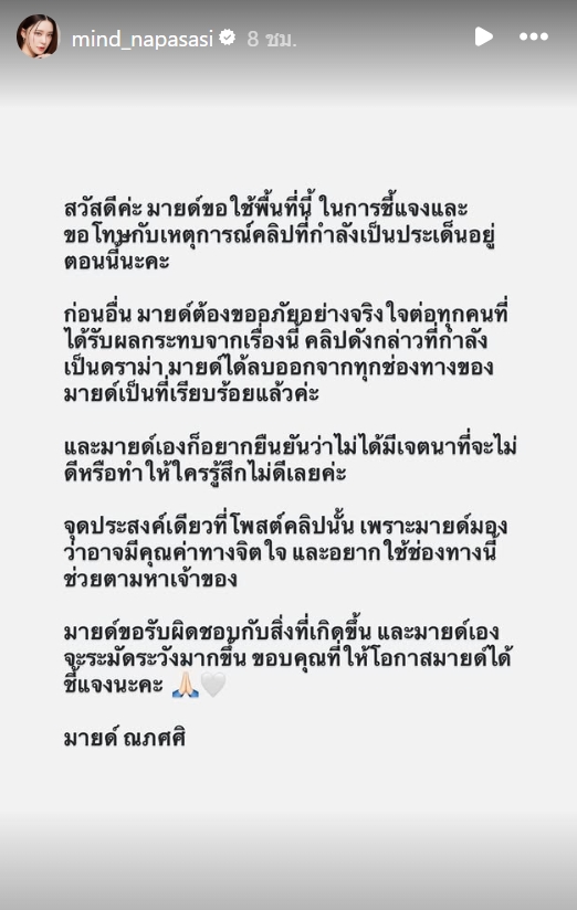 "สวัสดีค่ะ มายด์ขอใช้พื้นที่นี้ ในการชี้แจงและขอโทษกับเหตุการณ์คลิปที่กำลังเป็นประเด็นอยู่ ตอนนี้นะคะ ก่อนอื่น มายด์ต้องขออภัยอย่างจริงใจต่อทุกคนที่ได้รับผลกระทบจากเรื่องนี้ คลิปดังกล่าวที่กำลังเป็นดราม่า มายด์ได้ลบออกจากทุกช่องทางของ