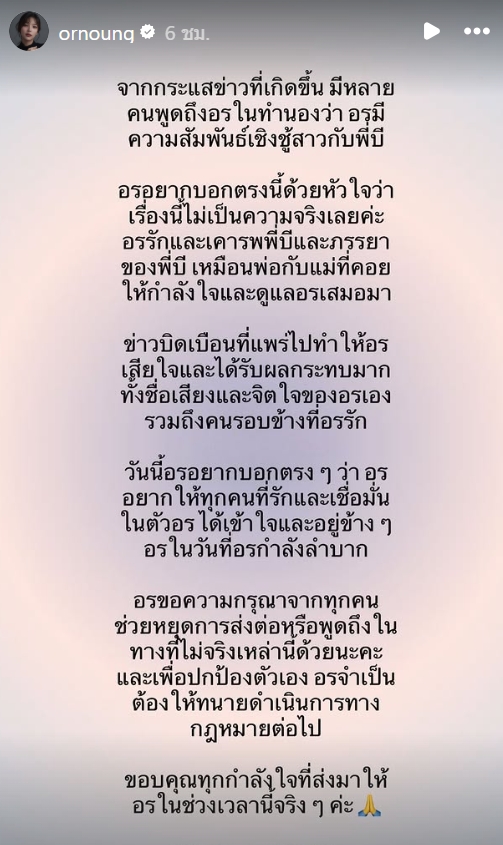 "วันนี้อรอยากบอกตรงๆ ว่า อรอยากให้ทุกคนที่รักและเชื่อมั่นในตัวอร ได้เข้าใจและอยู่ข้างๆ อรในวันที่อรกำลังลำบาก อรขอความกรุณาจากทุกคนช่วยหยุดการส่งต่อหรือพูดถึงในทางที่ไม่จริงเหล่านี้ด้วยนะคะ"