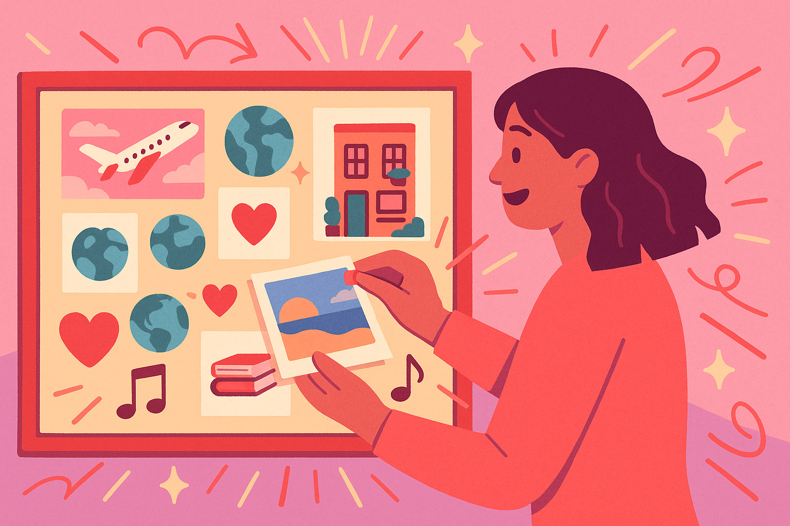 การรวบรวมภาพที่สอดคล้องกับเป้าหมายของคุณเองในอนาคต ไม่ว่าจะเป็นทริปในฝัน อาชีพที่ชอบ หรือความสัมพันธ์ที่อบอุ่น แล้วจัดเรียงเป็นคอลลาจหรือใช้เป็นวอลเปเปอร์มือถือให้มองเห็นทุกวัน การค้นหา คัดเลือก และมองภาพเหล่านี้ซ้ำๆจะช่วยให้เห็นภาพความฝันชัดเจนขึ้น