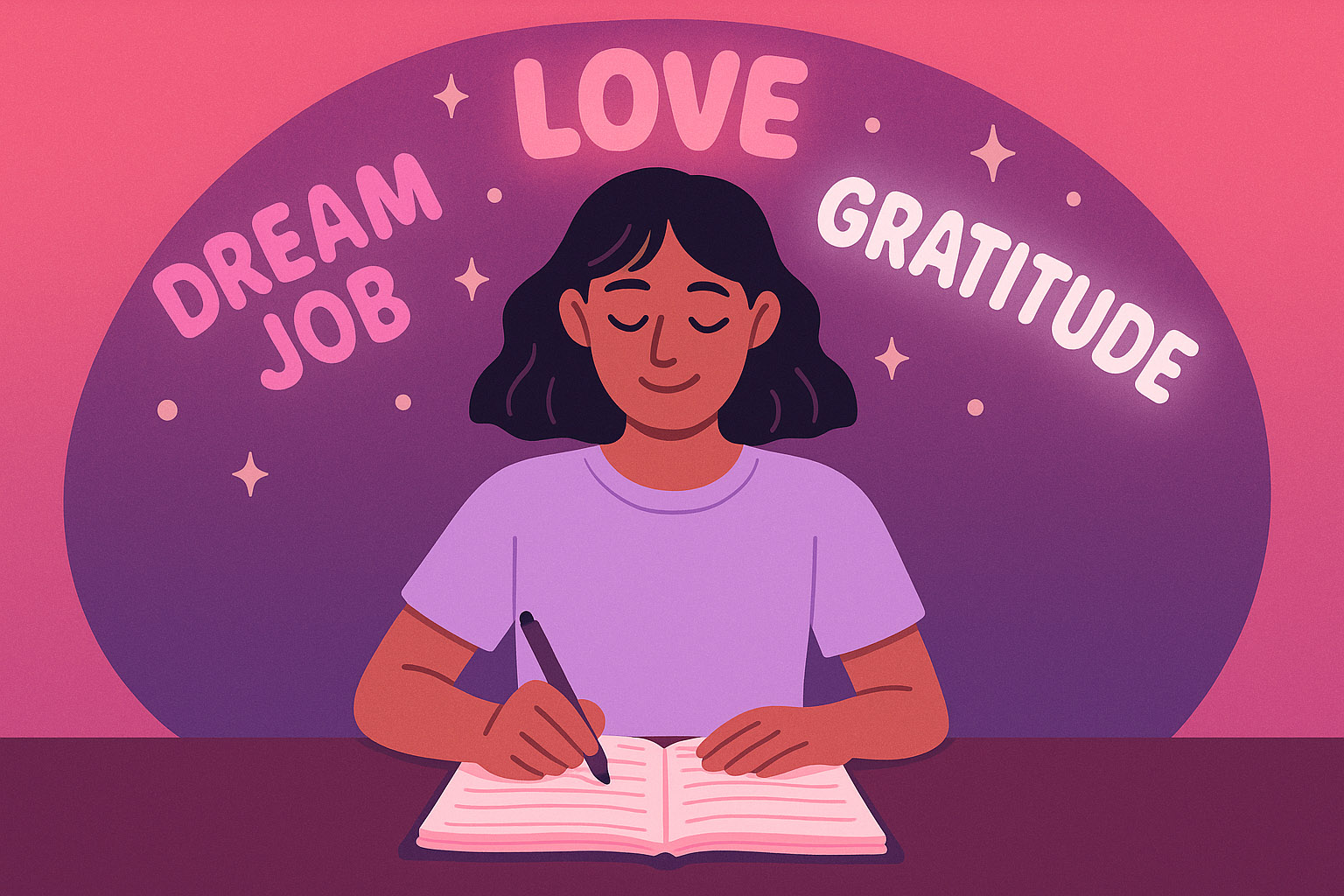 การเขียนไดอารี่เปรียบเสมือนการส่งสคริปต์ประจำวันส่งให้จักรวาลรับรู้ แทนที่จะเขียนสิ่งที่คุณอยากได้ ให้เขียนราวกับว่าสิ่งนั้นเป็นของคุณอยู่แล้ว เช่น “ฉันประสบความสำเร็จกับอาชีพในฝัน” หรือ “ฉันรู้สึกขอบคุณที่มีคนรักที่ดีในชีวิต” เคล็ดลับคือการใส่ความรู้สึกลงไปให้สัมผัสถึงความสุข ความตื่นเต้น หรือความมั่นคง เหมือนสิ่งนั้นเกิดขึ้นแล้ว