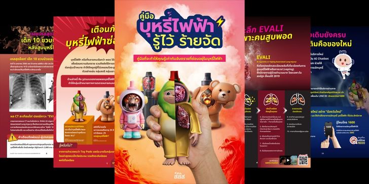 หากคุณยังคงเชื่อว่าบุหรี่ไฟฟ้าไม่อันตราย หรืออันตรายน้อยกว่า ตามคำกล่าวอ้างของอุตสาหกรรม ผู้จัดจำหน่าย หรือผู้ใช้งานเอง โปรดพิจารณาข้อมูลอันตรายที่แท้จริงเหล่านี้จาก คู่มือบุหรี่ไฟฟ้ารู้ไว้ร้ายจัด ที่ สสส. ตั้งใจจัดทำขึ้นเพื่อประชาชนโดยเฉพาะ