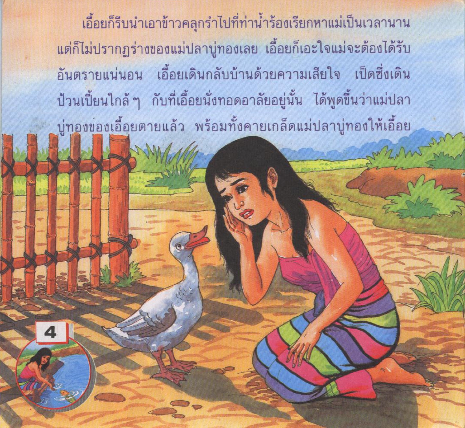 ปลาบู่ทอง ถูกเล่าซ้ำหลายเวอร์ชั่น แต่ไม่ว่าแบบไหนก็เต็มไปด้วยโศกกรรม แม่ของเอื้อยที่กลับชาติมาเกิดหลายครั้งถูกฆ่าซ้ำแล้วซ้ำเล่า ทั้งถูกทอดเป็นปลา ถูกหักคอเมื่อเป็นต้นมะเขือ จนถึงเอื้อยเองที่ถูกต้มในน้ำเดือด ก่อนจะเกิดใหม่เป็นนกแขกเต้าแล้วถูกถอนขนเตรียมต้มกินอีก ท้ายที่สุด ความชั่วของ “นางอ้าย” ก็ถูกเปิดโปง แต่เธอเลือกกินยาพิษฆ่าตัวตายหนีความผิด ทว่าพระราชาพรหมทัตยังคงเคียดแค้นกับสิ่งที่นางทำต่อมเหสีเอื้อย จึงสั่งให้นำศพนางอ้ายไปทำเป็นปลาร้า แล้วส่งไปให้พ่อแม่ของนางกิน เป็นฉากปิดฉากที่โหดเหี้ยมและสะเทือนใจสุดๆ