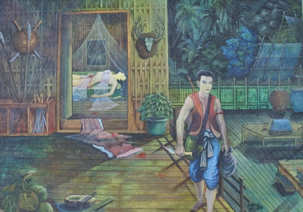 ศิลปวัฒนธรรม ภาพขุนแผนฆ่านางบัวคลี่ จิตรกรรมฝาผนังที่ระเบียงคดรอบวิหารหลวงพ่อโต วัดป่าเลไลยก์