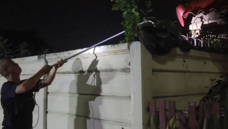 เมื่อเจ้าหน้าที่กู้ภัยมาถึง พบงูเหลือมยักษ์ยาวกว่า 3 เมตร ขดนิ่งอยู่บนกำแพงเหล็กแหลม ท่าทางสงบแต่จ้องมองไม่วางตา เจ้าหน้าที่จึงใช้อุปกรณ์บ่วงคล้องคอเพื่อจับอย่างระมัดระวัง ทว่าเพียงแค่งูรู้ตัว มันได้ดิ้นสะบัดอย่างรุนแรงจนบ่วงหลุด และพยายามเลื้อยหนีอย่างรวดเร็ว