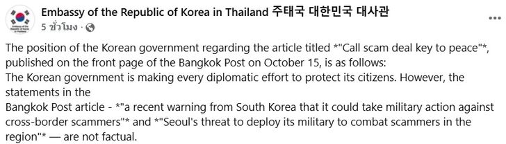 รัฐบาลเกาหลีใต้กำลังดำเนินความพยายามทางการทูตทุกวิถีทางเพื่อปกป้องพลเมืองของตน อย่างไรก็ตาม เนื้อหาบางส่วนในบทความของสื่อดังกล่าว ที่ระบุว่า “คำเตือนล่าสุดจากเกาหลีใต้ว่าอาจใช้ปฏิบัติการทางทหารกับแก๊งคอลเซ็นเตอร์ข้ามพรมแดน” และ “โซลขู่จะส่งกองทัพเข้าปราบแก๊งคอลเซ็นเตอร์ในภูมิภาค” นั้น ไม่เป็นความจริง