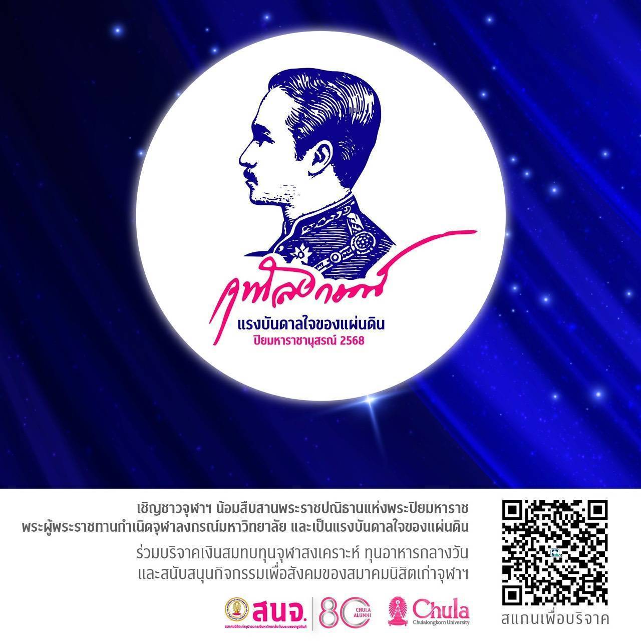 ขอเชิญชาวจุฬาฯและผู้มีจิตศรัทธาร่วมน้อมสืบสานพระราชปณิธานแห่งพระปิยมหาราช พระผู้เป็นแรงบันดาลใจของแผ่นดิน ร่วมบริจาคเงินสมทบทุนจุฬาสงเคราะห์ ทุนอาหารกลางวัน และสนับสนุนกิจกรรมเพื่อสังคมของ สนจ. ผ่านระบบออนไลนผ่าน QR Code โดยใช้แอพพลิเคชั่นธนาคารใดก็ได้ แล้วเลือกไปที่ “สแกนจ่าย“ ส่องที่คิวอาร์โค้ด หรือสำหรับท่านที่บันทึกภาพคิวอาร์นี้เก็บไว้ในโทรศัพท์มือถือแล้ว สามารถกดเลือกภาพคิวอาร์โค้ดนี้ขึ้นมาจากใน Library เพื่อเข้ามาที่หน้าทำรายการ E-Donation ของมูลนิธิสมาคมนิสิตเก่าจุฬาฯ กรอกตัวเลขยอดเงินบริจาคได้ตามกำลังศรัทธา ตรวจสอบและกดยืนยัน ท่านจะได้รับสลิปเก็บไว้ที่ Library คลังภาพในโทรศัพท์ โดยไม่ต้องติดต่อขอรับใบเสร็จ ระบบจะนำส่งลดหย่อนภาษีให้ท่านอัตโนมัติ และสามารถตรวจสอบได้ในระบบ E-revenue ของกรมสรรพากรภายใน 1-2 วัน หลังทำรายการที่ลิงก์นี้ https://epayapp.rd.go.th/rd-edonation/portal/for-donor?lFrom=eFiling&uType=T