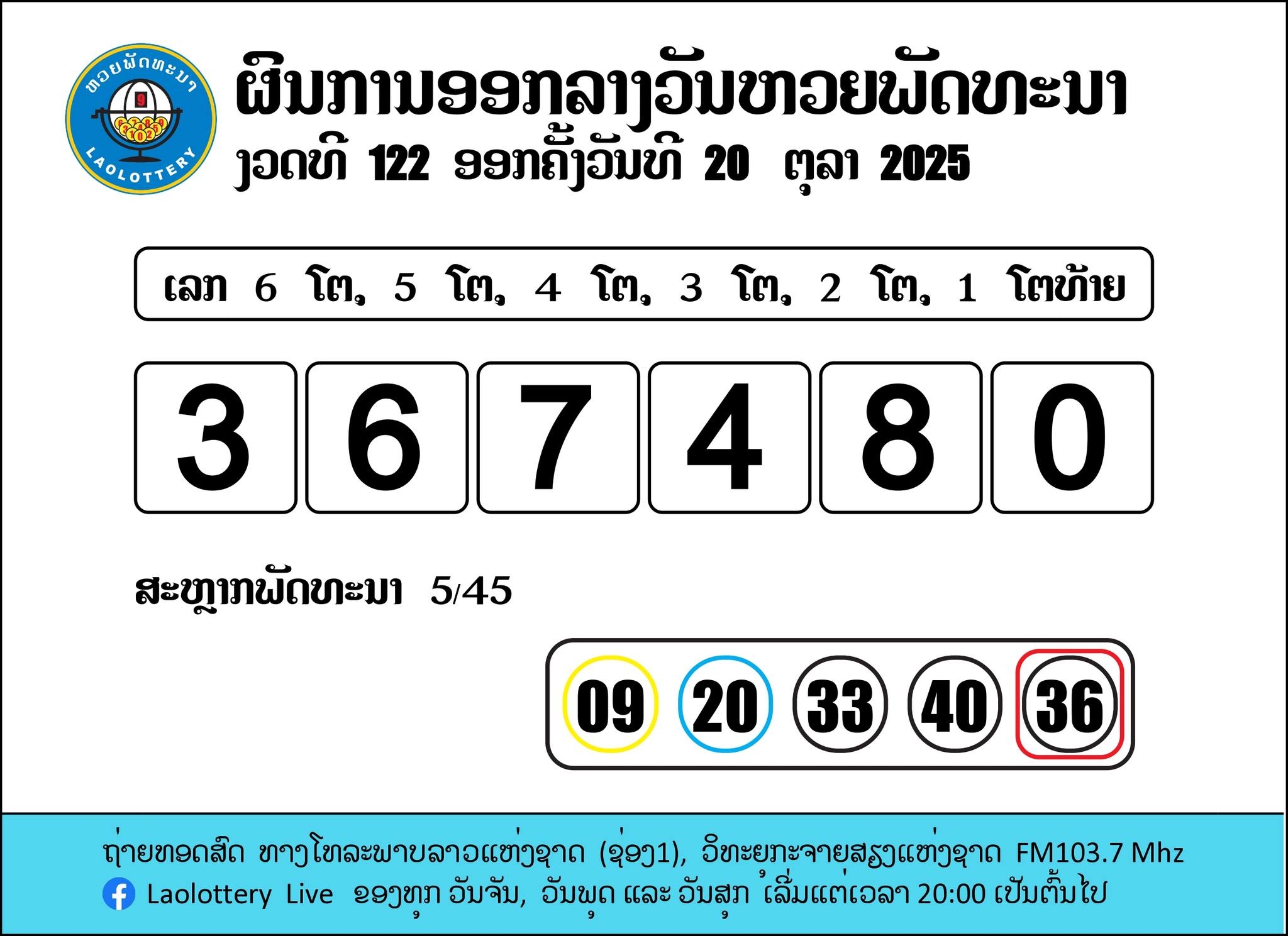 ผลสลากพัฒนาหวยลาว 5/45 งวดวันที่ 20 ตุลาคม 2568
