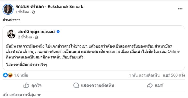 รักชนก ศรีนอก ส.ส. พรรคประชาชน แชร์โพสต์ "บก.ลายจุด" สมบัติ บุญงามอนงค์ เปิดโปงพรรคการเมืองใช้กลยุทธ์ "แจกของ" แฝง "ใบสมัครสมาชิก" โดยที่ชาวบ้านไม่รู้ตัว พร้อมตั้งคำถามถึงความกล้าหาญในการกระทำดังกล่าว