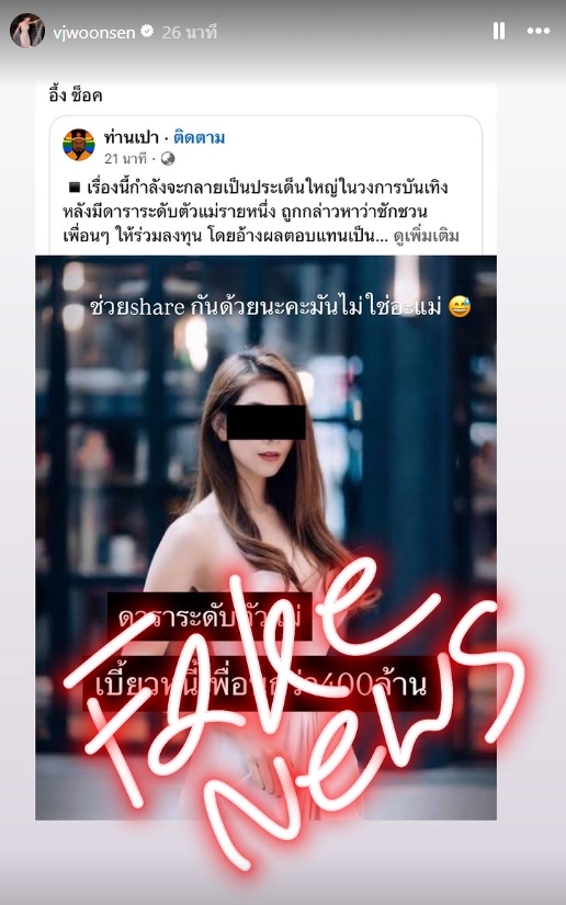 "วุ้นเส้น วิริฒิพา" ชี้แจงแล้ว ถูกโยงดาราตัวแม่เบี้ยวเงิน 400 ล้านวุ้นเส้น วิริฒิพา เก้าอี้ร้อนเลย ถูกโยงข่าวจนต้องออกมาเคลียร์ว่าไม่ใช่ตนเอง พร้อมกับเผยภาพข่าวต้นเรื่อง