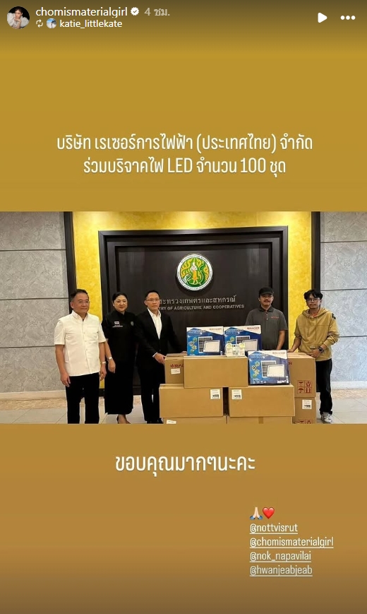 และ โคมไฟฉุกเฉิน จำนวน 50 โคม แก่ กระทรวงเกษตรและสหกรณ์โดยมี นายภูผา ลิกค์ ดำรงตำแหน่ง เลขาธิการรัฐมนตรีว่าการกระทรวงเกษตรและสหกรณ์ และ นางสาวนฤมล สงวนวงศ์ รองปลัดกระทรวงเกษตรและสหกรณ์ เป็นผู้แทนรับมอบ