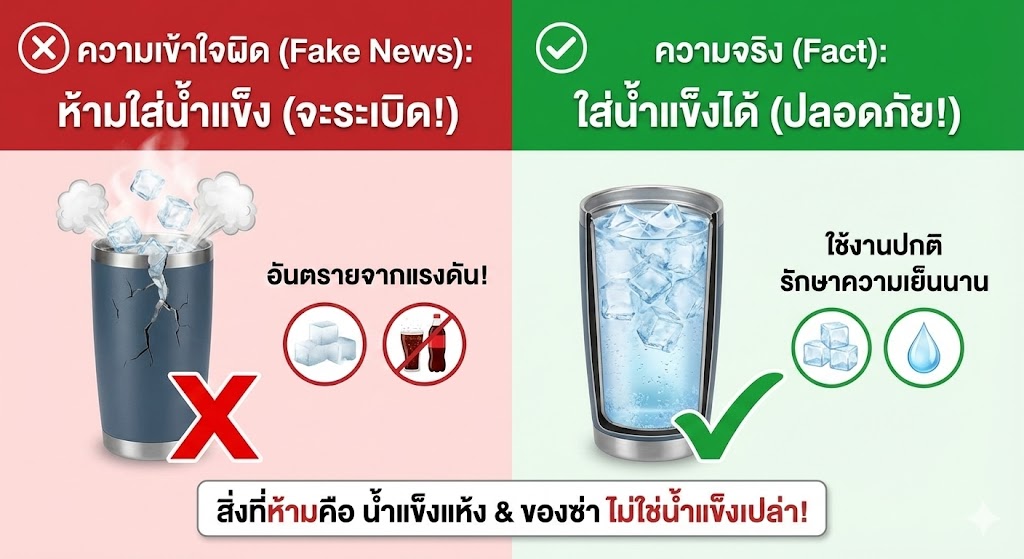 ข้อเท็จจริงคือ “กระบอกหรือแก้วเก็บอุณหภูมิส่วนใหญ่สามารถใส่น้ำแข็งได้” การแชร์ว่าห้ามใส่น้ำแข็งในกระบอก/แก้วเก็บอุณหภูมิทุกชนิดเพราะจะระเบิดหรือเป็นอันตราย ถือเป็นข้อมูลคลาดเคลื่อนและเข้าข่ายข่าวปลอม (Fake News) สิ่งที่ผู้ใช้ต้องระวังจริงๆ คือห้ามใส่น้ำแข็งแห้ง (Dry Ice) ห้ามใส่น้ำอัดลมหรือของเหลวที่บูดเสียแล้วเกิดแก๊สในภาชนะปิด และควรเว้นพื้นที่ว่างไม่เติมจนแน่น รวมถึงอ่านคำเตือนในคู่มือผู้ผลิตของแต่ละรุ่นก่อนใช้เสมอ