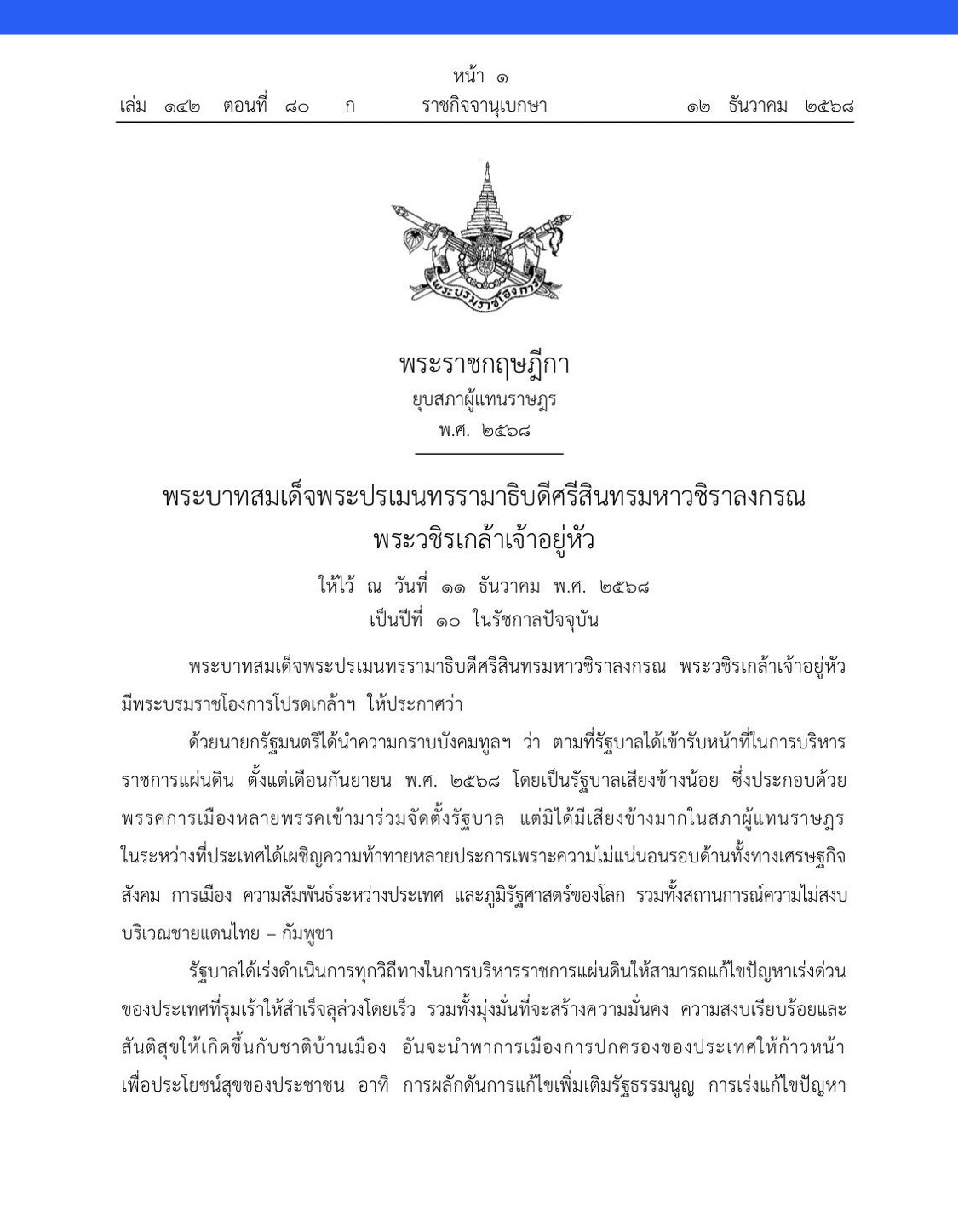 วันที่ ๑๒ ธ.ค. ๒๕๖๘ เว็บไซต์ราชกิจจานุเบกษา เผยแพร่ พระราชกฤษฎีกายุบสภาผู้แทนราษฎร พ.ศ. ๒๕๖๘ ระบุว่า