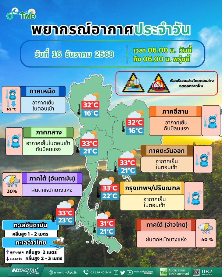 พยากรณ์อากาศวันนี้ กรมอุตุฯ เตือน ภาคใต้ตอนล่างยังคงมีฝนตกหนัก ส่วนภาคเหนืออุณหภูมิลด 1-2 องศาฯ