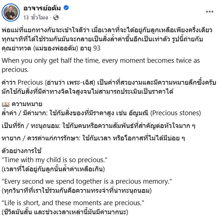 ล่าสุด อาจารย์อดัมได้โพสต์ข้อความเพิ่มเติม ระบุว่า การเลิกราไม่จำเป็นต้องมีการแบ่งฝ่ายหรือเลือกข้าง โดยข้างเดียวที่ควรเลือกคือ “ข้างลูก” พร้อมเสนอแนวคิดการเปลี่ยนสถานะจากคู่รัก เป็นพันธมิตรในการเลี้ยงดูบุตร ลดทิฐิเพื่อให้ลูกได้รับความรักจากทั้งสองฝ่าย