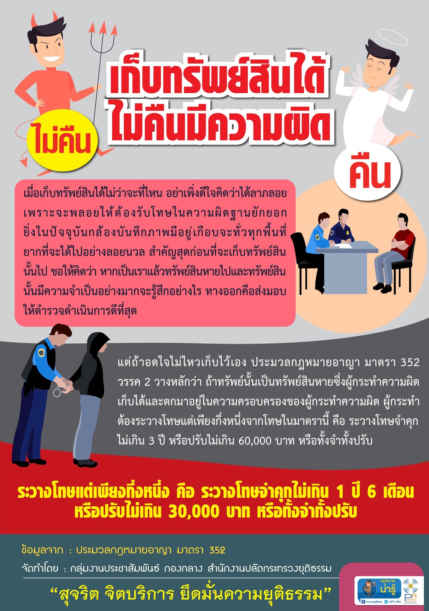 ทั้งนี้ กระทรวงยุติธรรมได้ให้คำแนะนำเพิ่มเติมว่า ในปัจจุบันมีกล้องวงจรปิดครอบคลุมเกือบทุกพื้นที่ ยากที่จะรอดพ้นการตรวจสอบ ทางออกที่ดีที่สุดเมื่อพบเจอทรัพย์สินของผู้อื่น คือการส่งมอบให้เจ้าหน้าที่ตำรวจดำเนินการติดตามหาเจ้าของ เพื่อความถูกต้องและสบายใจ