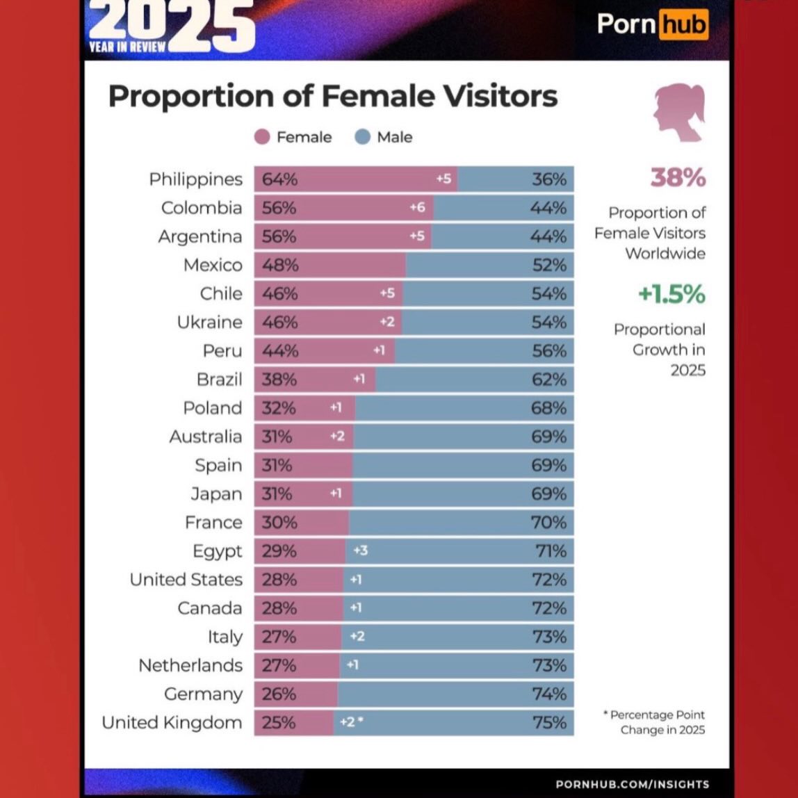หากถามว่าสาวๆ ชาติไหนเข้าชมเว็บไซต์นี้มากที่สุด คำตอบคือ ประเทศฟิลิปปินส์ ซึ่งครองแชมป์ด้วยสัดส่วนผู้ชมหญิงสูงถึง 64% (เพิ่มขึ้น 5 จุดจากปีก่อน) นับเป็นประเทศเดียวในรายการ Top 20 ที่มีผู้หญิงดูมากกว่าผู้ชายอย่างชัดเจน รองลงมาคือประเทศในแถบละตินอเมริกาอย่าง โคลอมเบีย และ อาร์เจนตินา ที่มีสัดส่วนผู้ชมหญิงอยู่ที่ 56% เท่ากัน ในขณะที่ประเทศยักษ์ใหญ่อย่างสหรัฐอเมริกา กลับมีสัดส่วนผู้ชมหญิงเพียง 28% เท่านั้น
